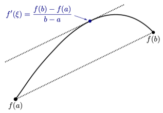 함수 $f$가 닫힌구간 $\left [ a,b \right ]$ 에서 연속이고 열린구간 $\left ( a,b\right )$ 에서 미분가능할 때, 다음을 만족하는 $c$가 $a<c<b$ 에 적어도 하나 존재한다.