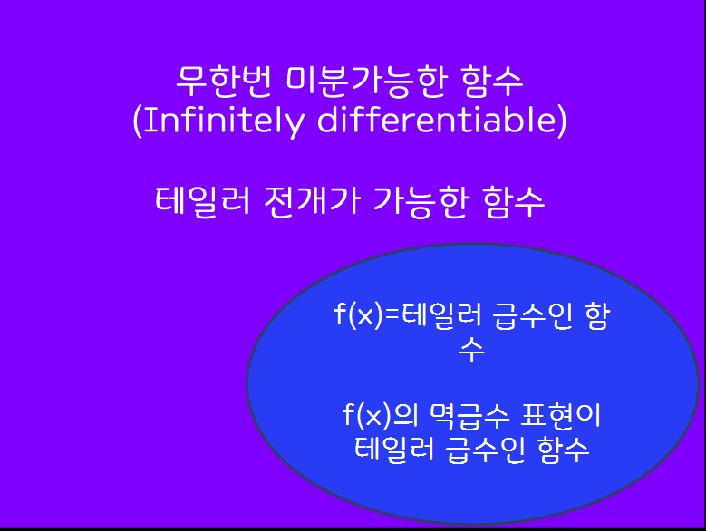 그렇다면 이제 용어표현을 정확히 고쳐써 보도록 합시다. 이 전 포스팅에서 '멱급수 표현식과 테일러 급수가 같을 때' 또는 '같지 않을 때'라는 문장을 많이 사용했는데, 이해를 돕기 위해 제가 위조를 가한 것이었고, 수학적으로 정확한 표현은