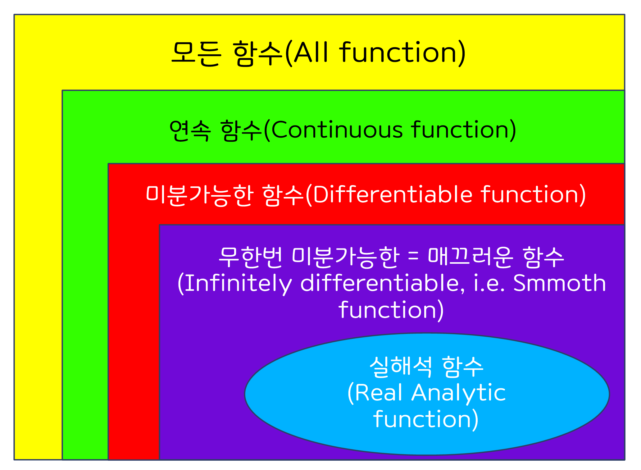 어떻게 다른지 근거를 제시해야겠죠? 실함수에 대하여 해석적이라는 것과 미분가능의 관계는 다음과 같습니다. 안타깝게, 필요충분조건이 못 되는 관계였던 겁니다.