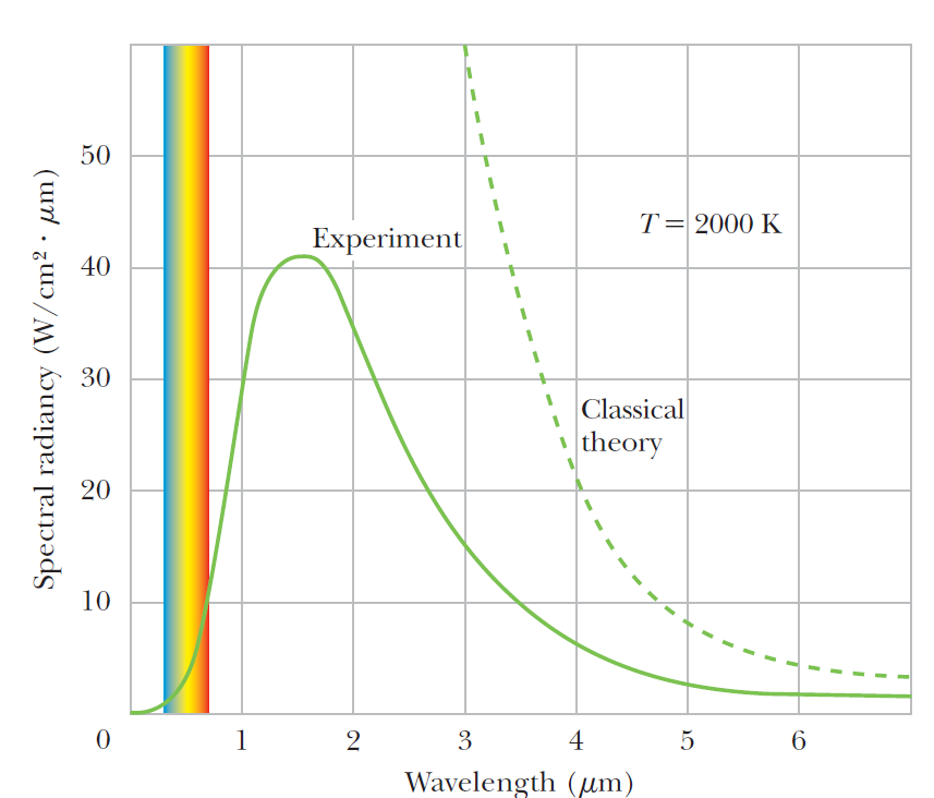 결국 파장이 긴 곳이나 짧은 곳이나 고전적으로 해결하지 못하는 문제가 생깁니다. 고전적이라는 것은 곧 레일리-진스 법칙과 빈의 변위 법칙을 뜻하는 것입니다.