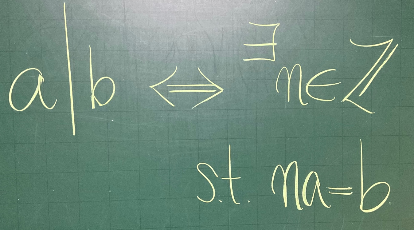 나눈다와 나누어진다의 뜻의 정의는 특별히 학부 과목이라고 해도 우리가 중·고등학교때 배운 것과 별 다름이 없습니다. 다만 기호 표기가 하나 등장했습니다. 앞으로 $b\mid a$ 기호는 수없이 등장할 것인데, 짝대기는 단순히 'bar' 정도로 읽으면 되고 앞의 숫자가 작은 숫자, 즉 나누는 숫자이며 뒤의 숫자가 나누어지는 큰 숫자입니다. (일반적으로 작은 수로 큰 수를 나누기 때문에 이렇게 표현했습니다) 선형대수학에서 최소다항식을 적을 때도 $p(t)\mid f(t)$ 라는 표현을 사용하지요. 여기서와 똑같은 표현입니다.