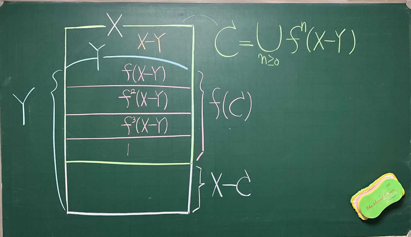 그리고 $C:=\displaystyle \bigcup_{n\geq 0}^{}f^n(X-Y)\;,\;n\in\mathbb{N}$ 이라는 함수를 정의하고 싶은데, 여기서 $n=0$ 일 때는 $f^0 : X\rightarrow X$ 를 항등함수로 생각하고, $n\geq 1$ 일 때는 $f^k:f\circ f^{k-1}$ 로 생각한다. 그러면 $X-Y=I(X-Y)=f^0(X-Y)\subseteq \displaystyle \bigcup_{n\geq 0}^{}f^n(X-Y)=C$ 이 되고,