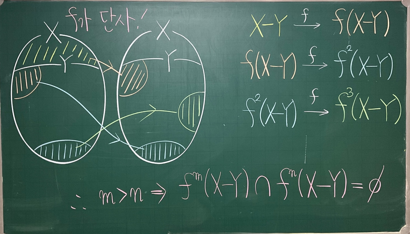 그런데 마지막 줄에서 $x\in X-Y$ 이고, $f^{m-n}(x') \in Y$ 인데, $f^{m-n}(x')\in \left[ (X-Y)\cap Y \right]$ 일 수는 없다.[각주:4] 그러므로 모순이다.
