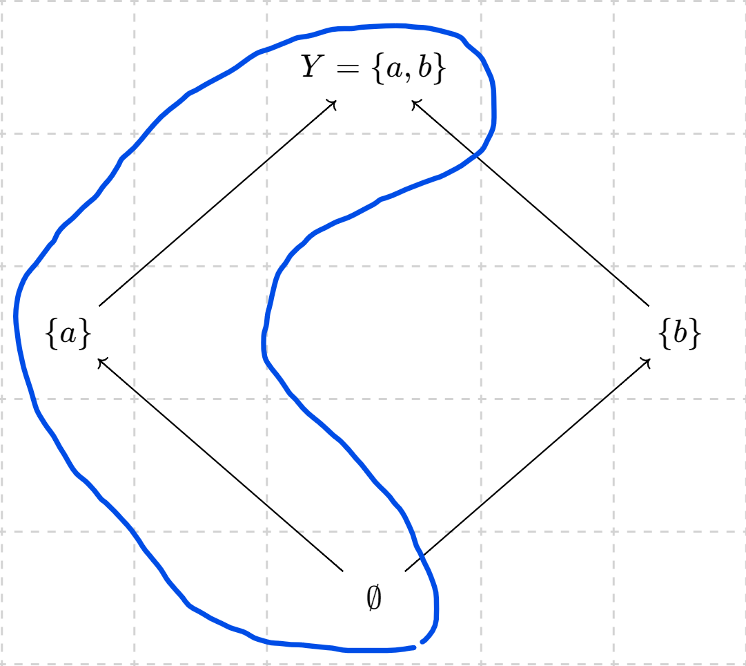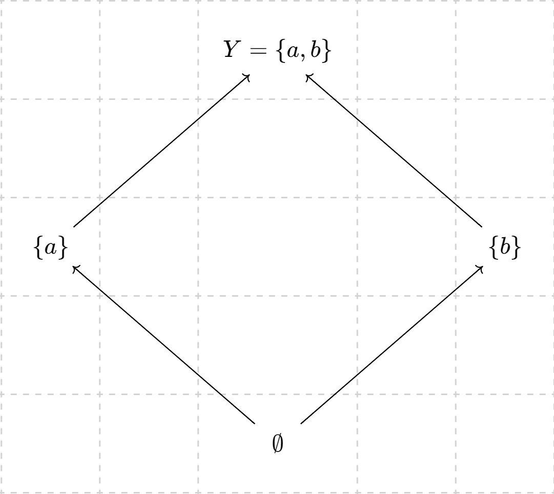 이때 부분순서집합 $\left( \mathcal{P}(Y),\subseteq \right)$ 은 위 다이어그램처럼 도식화 할 수 있다. 화살표는 아래에서 위쪽, 즉 부분집합(subset)에서 초집합(superset)으로 움직이므로 다음과 같이 부분순서와 화살표 관계를 정의할 수 있다.