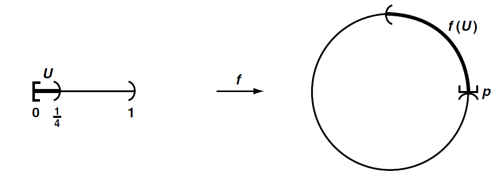 그런데 만일 $g=f^{-1}$ 가 연속임을 보이려면 연속의 정의에 의해 $g$ 의 공역 $[0,1)$ 에서의 열린집합 $U$ 에 대하여 $g^{-1}(U)=f(U)$ 가 $S^1$ 에서 열린집합이어야 한다. 그런데 점 $p=f(0)=(1,0)\in f(U)$ 을 생각하자. $S^1$ 은 $\mathbb{R}^2$ 의 부분공간이고, 이 $f(0)$ 도 $S^1$ 에서 열린집합이려면 $V\cap S^1 \subseteq f(U)$ 가 성립하게 하는 $\mathbb{R}^2$ 에서의 열린집합 $V$ 가 존재해야 한다. 이는 2차원 평면에서의 열린집합으로 열린공이라고 생각해도 좋다. 그런데 점 $p$ 를 포함하는 열린공을 $\mathbb{R}^2$ 에서 잡는 순간 그것은 $f(U)$ 에 포함되지 못한다. $f(U)$ 가 반시계방향으로 $\displaystyle\frac{1}{4}$ 바퀴 호의 영역이기 때문이다. 따라서 $g$ 는 연속이 아니므로, $f$ 는 전단사이고 연속이지만 위상동형사상은 아니다. $_\blacksquare$