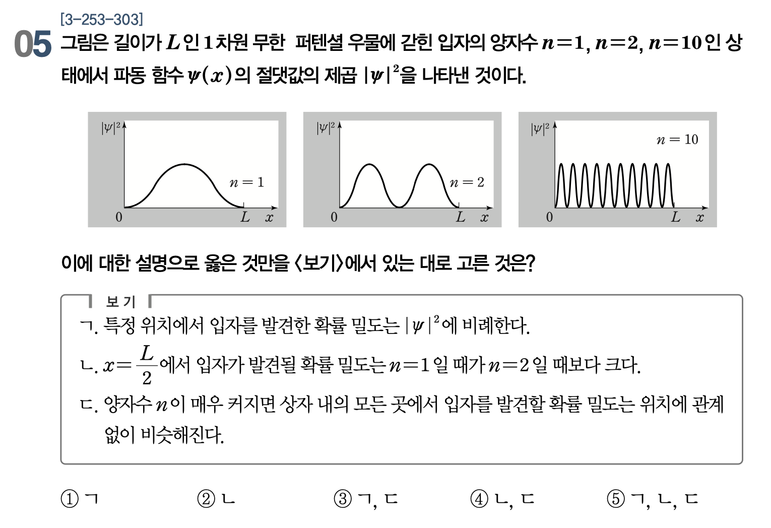 ㄷ. 양자수 $n$ 이 매우 커지면 상자 극대와 극소가 $0<x<L$ 사이에서 무한히 많아지고, 이는 이 구간에서 어느 한 지점의 확률밀도가 다른 지점에 비해 높게 나타나지 않는다는 것을 뜻한다. 다시 말해 상자 내의 모든 곳에서 입자를 발견할 확률 밀도는 위치에 관계 없이 비슷해지게 된다. (!) $_\blacksquare$