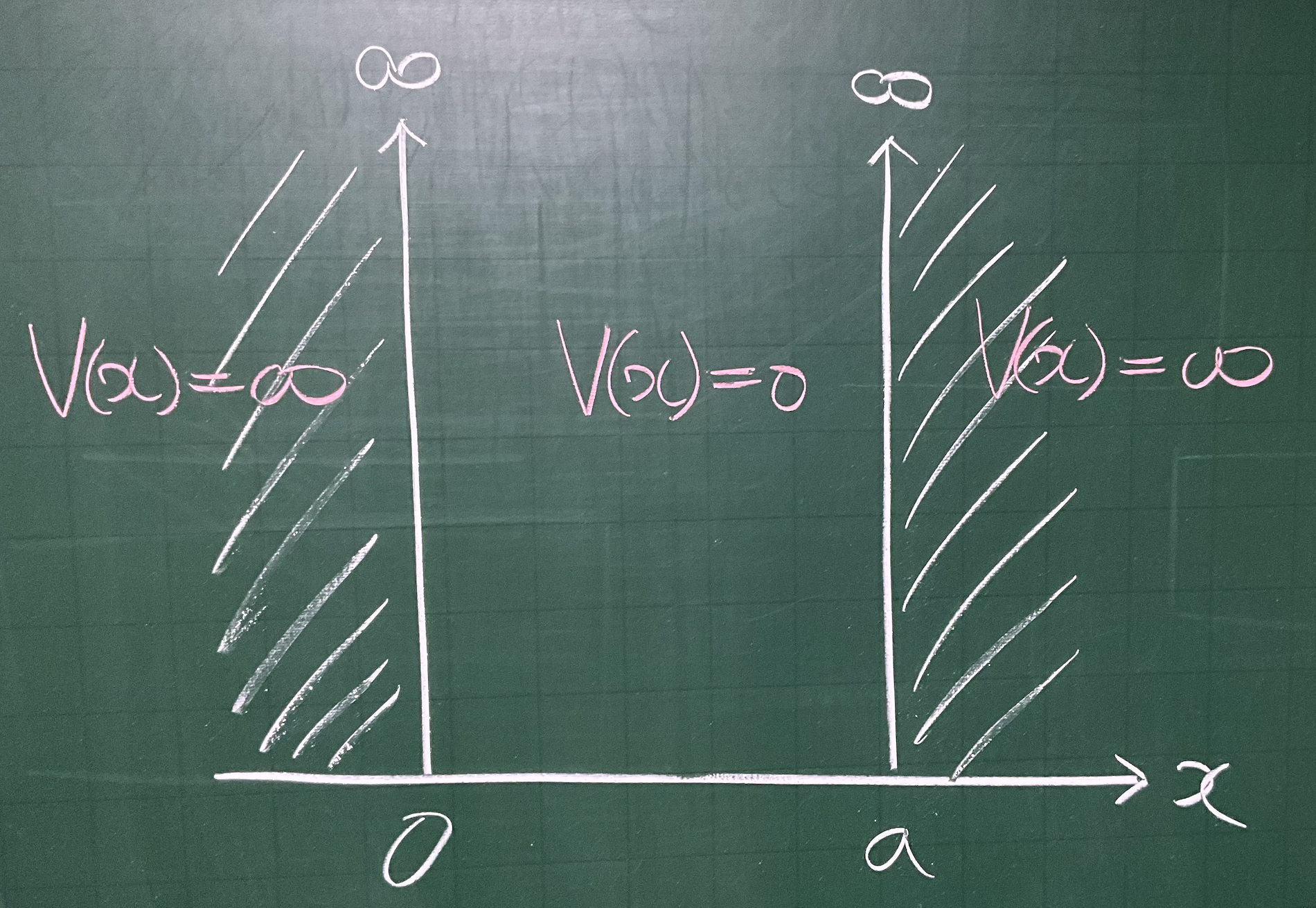 에 주어진 $V(x)$ 조건을 넣어서 해를 구하면 된다. 이때 입자의 에너지의 부호에 따라2 Case 를 분류해야 한다. 입자는 장벽을 벗어나는 것이 불가능하고 두 장벽 사이에 갇혀 있게 되므로 $0<x<a$ 를 관찰하기에 $V(x)=0$ 이다.