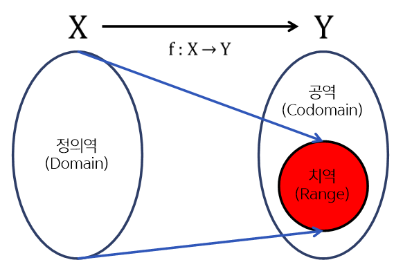 이 때 $X$와 $Y$를 각각 $f$의 '정의역(domain)', '공역(codomain)'이라 하고 집합 $\left \{ f(x)\mid x\in X \right \}$ 는 '치역(range)'이라 한다. 치역은 공역의 부분집합이다. 추가로 $f(x)$는 $f$에 의한 $x$의 상(image), $x$는 $f$에 의한 $f(x)$의 원상(preimage)라 한다.
