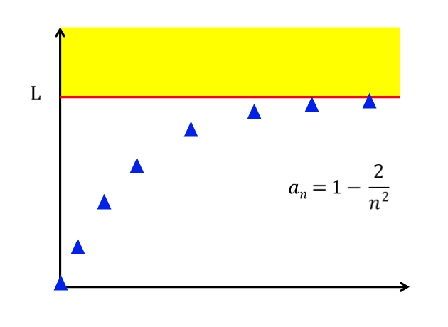 그러면 분명히 위로 볼록한 로그함수와 비슷한 개형이 그려지면서, 특정 L이라는 값이 수렴하는 것처럼 보일 것입니다. 여기서 유계의 개념을 도입하면, 직관적으로라도 수열 an이 위로 유계면서, 무수히 많은 상계가 존재하고, 결국 그 상계중에 가장 작은 값인 최소상계가 극한값이 된다는 것을 이해할 수 있습니다! 이것을 정리한 것이 단조수열정리/단조수렴정리에 해당합니다.